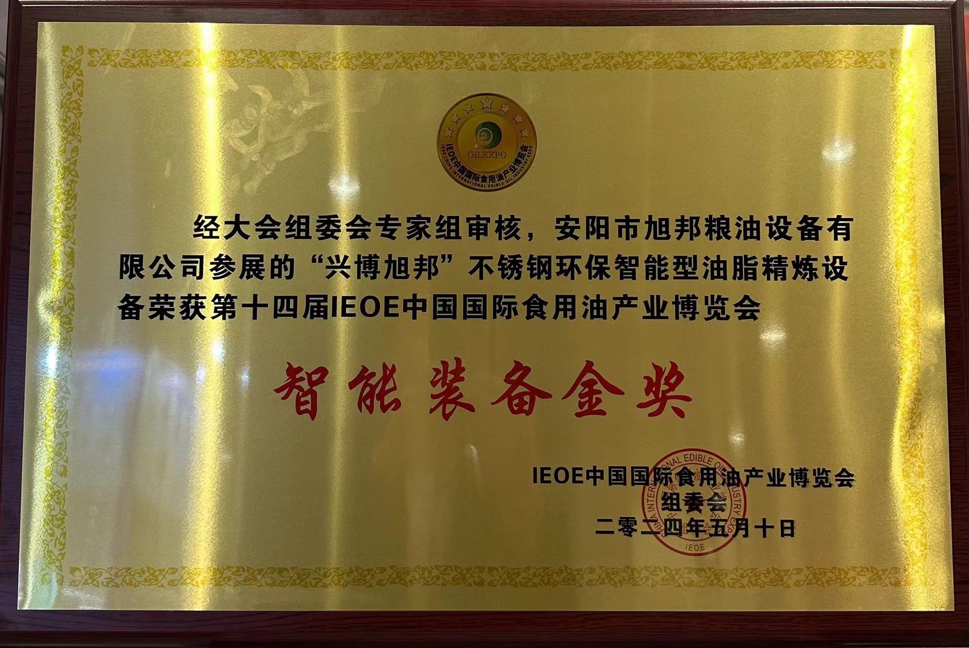 5月10日,第十四屆IEOE中國國際食用油產(chǎn)業(yè)博覽會在南京國際展覽中心啟幕。我公司參展的不銹鋼環(huán)保智能型油脂精煉設備經(jīng)大會組委會專家組審核,榮獲智能裝備金獎。